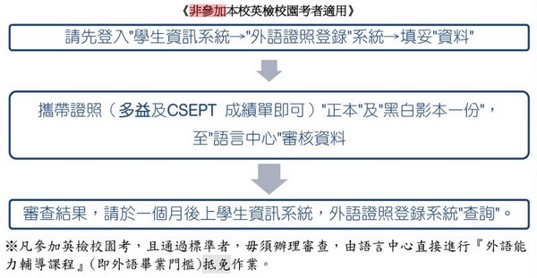 若於三年級第2學期結束前未能通過門檻標準,可檢附入學後參加英檢測驗未通過之成績證明,並經審查通過,始得於四年級選修「外語能力輔導課程」(0學分,36小時),並於課程結束後參加本校外語能力測驗,通過者始得畢業。